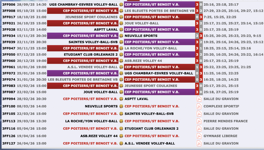 Calendrier & résultats N3F Calendrier Nationale 3 Féminine CEP 1 – Poule F En ligne sur le site de la FFVB